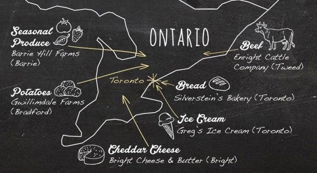 Grub: Their motto is "Real. Food. Fast." Their local producers include seasonal produce from Barrie Hill Farms in Barrie, potatoes from Gwillimdale Farms in Bradford, beef from Enright Cattle Company in Tweed, Bright Cheese & Butter’s cheddar cheese from Bright, Ontario, and Toronto’s own Silverstein bread and Greg’s Ice Cream.