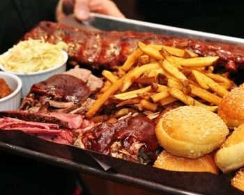 Regular menu items are huge, but it’s The Ultimate Platter (feeds 3-5) with Baby Back Ribs, Quarter Chicken, Pulled Pork, Brisket and Smoked Meat, served with fresh-cut fries, mac & cheese, smoky molasses beans, slaw and fresh buns, that arrives on a huge metal traythat stuns. No matter how many times you see it, it will always amaze you.