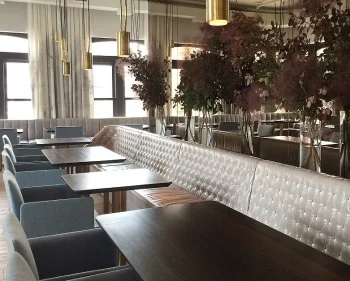 Commute Design created a striking and sexy room, playing with both modern and art deco features. Divided into a bar area and separate dining space, the sumptuous textures – luxe leathers, rare marble, eye-catching brass, mirrors, wood – exudes a deep richness and elegance.