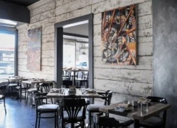 Fixtures & Fittings: Babic designed the large space, choosing the tables and wall fixtures. Sous Chef David Bell's paintings are featured throughout the space. The two rooms done in gray paint and light barnboard have a modern shabby chicness to them, complete with chandeliers.