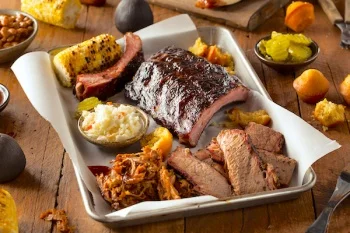 Menu items include Beef Brisket ($14 half pound/$28 pound), Pulled Pork ($12 half pound/$24 pound), Bama White Sandwich ($12) with smoked chicken, bacon, white bbq sauce, pickleand JackfruitSandwich ($10) with smoked jackfruit, jerk sauce, slaw. And a Hundy P Platter is available for a mere $100, featuring brisket, pulled pork, ribs, three chicken legs, three sausages & four sides.