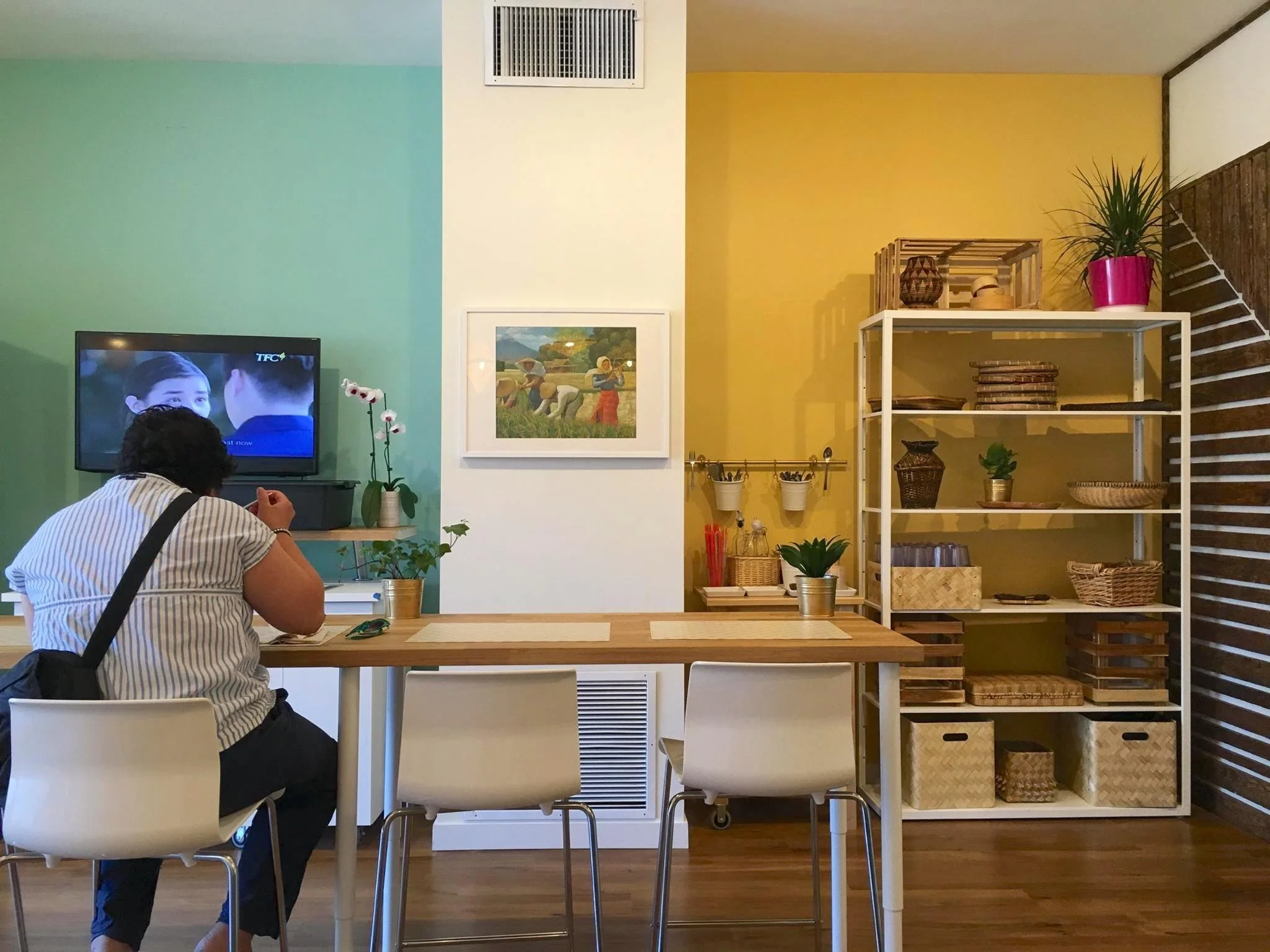 A communal table is set next to the TV. Filipino show play on the big screen all day, so no need to miss your favourite stories in Tagalog. Photo by Stephanie Dickison | Toronto Restaurants.