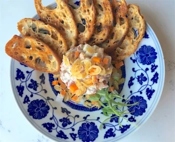 Steak Tartare ($15) A surf and turf of sorts, this fun and innovative, original creation showcases top sirloin, pickled veg for crunch, creamy wasabi oil not for the faint of heart, fried teeny tiny baby shrimp, and a dash of togarashi across crostini for extra kick.