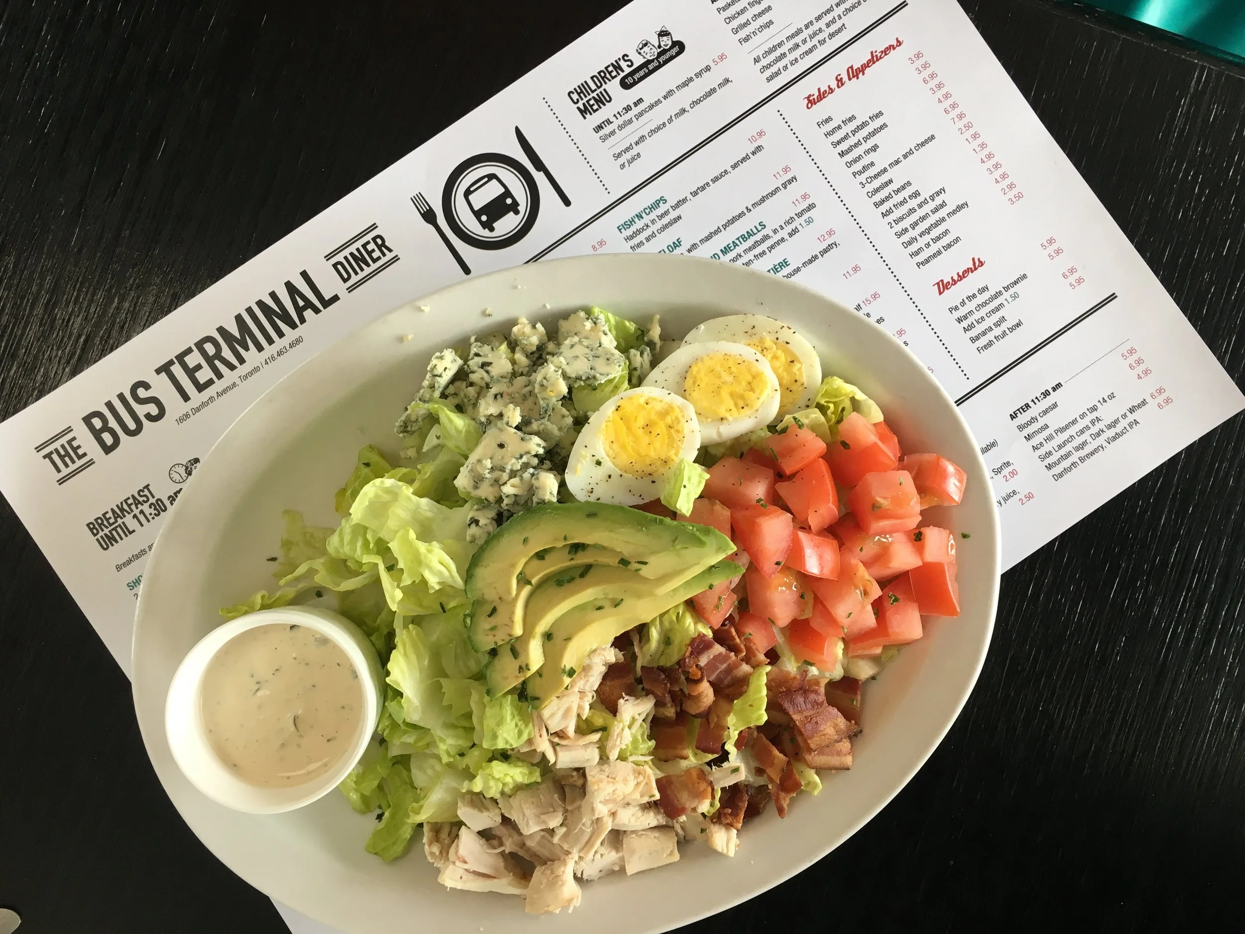 Thick chunks of freshly cooked chicken, bacon, hard-boiled eggs, thinly sliced avocado, lettuce, tomatoes, chives, and crumbled blue cheese are served with an addictive, tangy housemade ranch dressing.