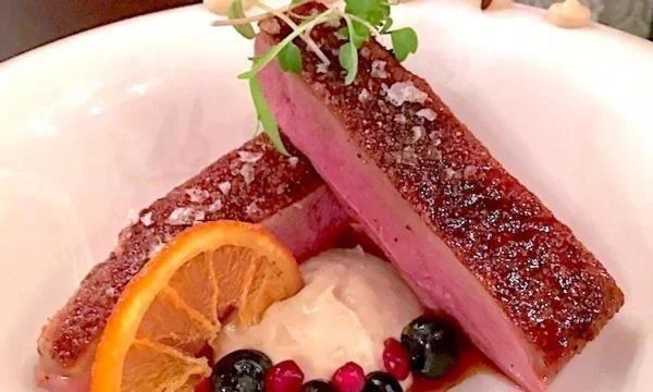 Orange Glazed Duck ($17) Two thick slices of crispy seared duck breast are swathed with sweet orange glaze, served with cauliflower puree, glazed blueberries and pomegranate arils. The presentation here is particularly of note – Modernist and playful, little dots of cauliflower puree have been added to just part of the bowl’s rim, then studded with the pomegranate arils.