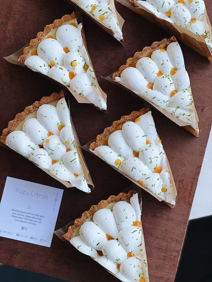 Yuzu Citron Tart. Gluten-free tart filled with yuzu custard, topped with cream cheese whip, fresh lime zest and passion fruit jelly.