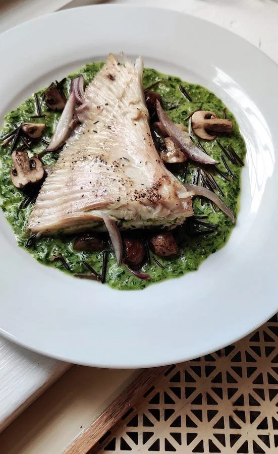 Skate Wing Fin With Preserved Ramp Pesto, Wild Cultivated Rice, Pickled Mushrooms and Braised Red Onions.