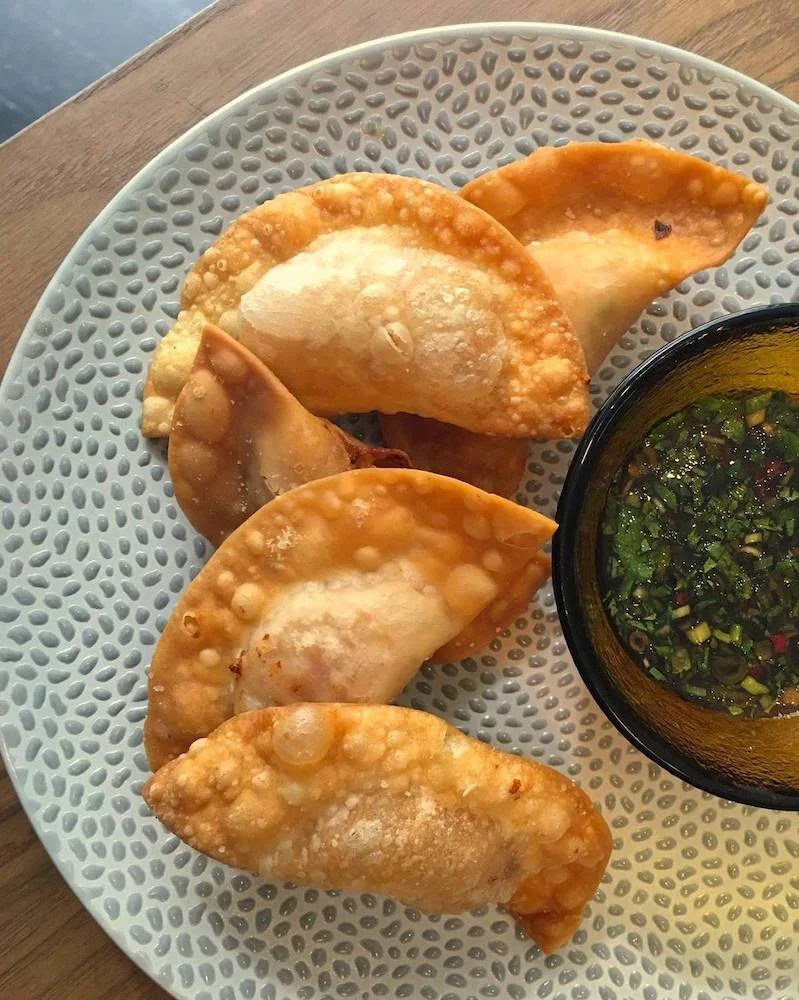 Fried Kimchi Dumplings ($10) Crispy golden fried pockets are filled with soft kimchi, bolstered with a zesty hot chili oil on the side. Watch out, they’re as addictive as potato chips.